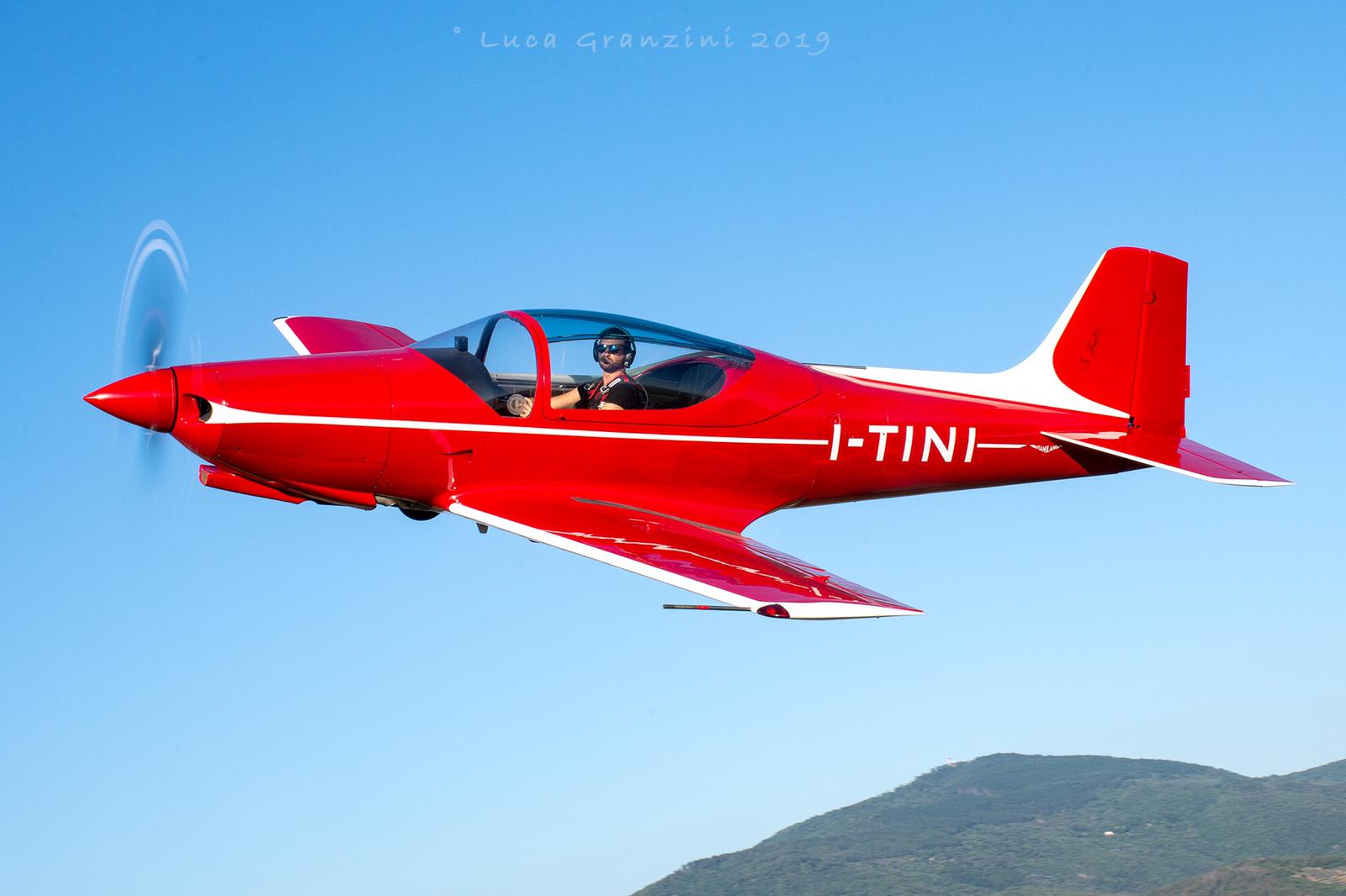 Mentre tiriamo fuori dall'hangar lo splendido I-TINI verniciato di rosso scuro, inizio a fare le mie usuali considerazioni. La missione di questo aereo è correre, essere preciso e veloce. Il piccolo impennaggio verticale, il tettuccio dell'abitacolo molto piatto e quelle ali corte, sottili e affilate come rasoi rendono l'idea al primo sguardo. Francesco mi racconta che, nella prima serie di test, hanno cercato di ridurre la resistenza aerodinamica progettando lo stabilizzatore con un'apertura di 10 cm in meno. Il pilota collaudatore Ettore Wengi non sembrava molto contento e soddisfatto dopo il test e Frati tornò immediatamente ad un piano orizzontale più ampio.